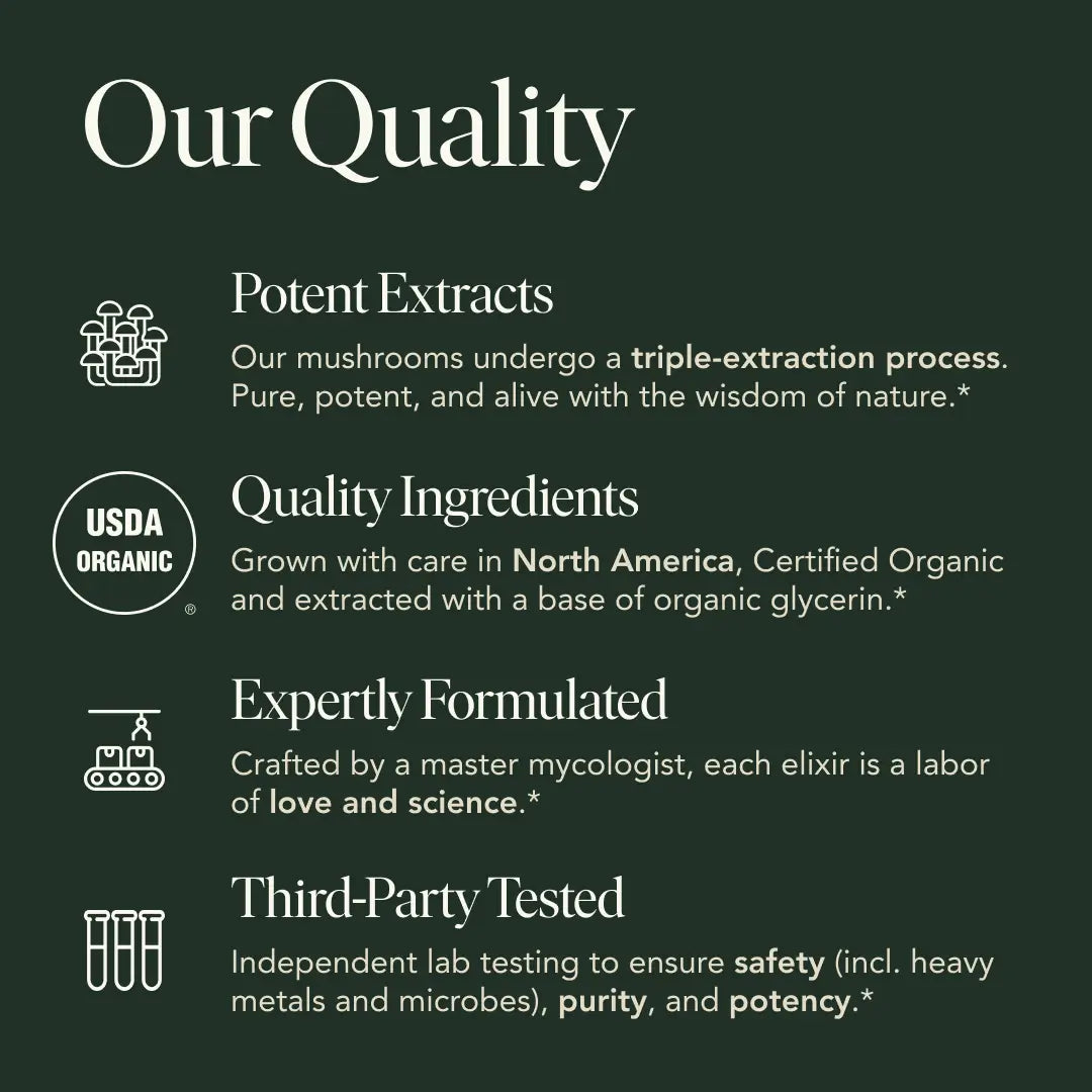 This vegan elixir is made from 100% USDA-certified organic mushrooms and botanicals, grown in North America. We use only the highest quality products - and no fillers - for an extract that captures the quality and true essence of each ingredient. Formulated by our master mycologist and produced in small batches, each elixir undergoes an average 100-day production process to ensure optimal quality, bioavailability and potency.