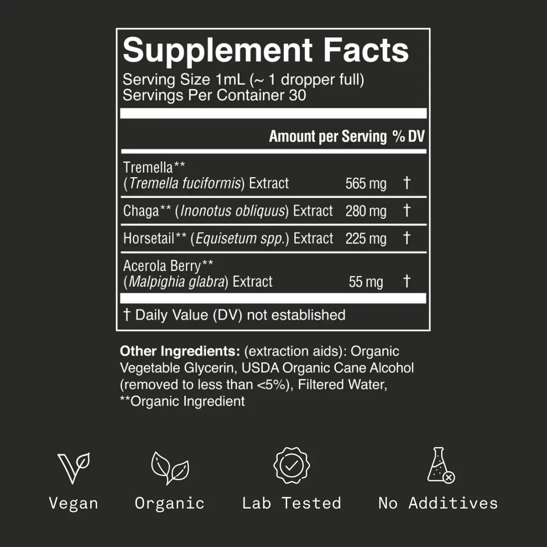 Our Beauty Elixir combines triple-extracted Tremella, Chaga, Horsetail, and Acerola to help restore skin elasticity, strengthen hair, and boost hydration. This inside-out blend supports natural collagen production while protecting against oxidative stress.*