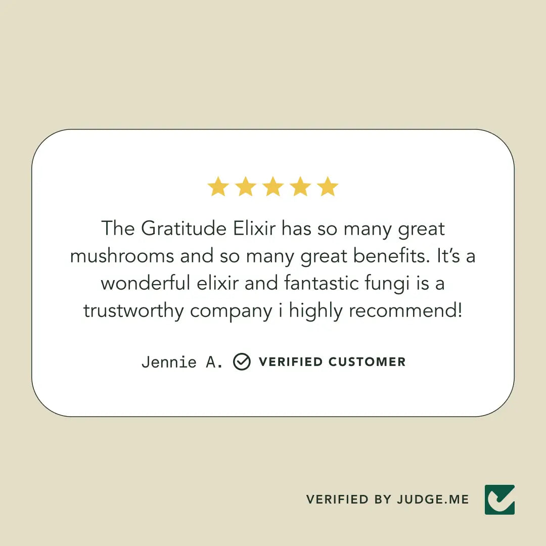 Our Gratitude Elixir is your daily ritual for body and mind wellness. With a selection of eight triple-extracted organic mushrooms, this elixir supports immune resilience, mental clarity, stress response, and emotional well-being from within. It’s our most complete expression of mushroom intelligence.*