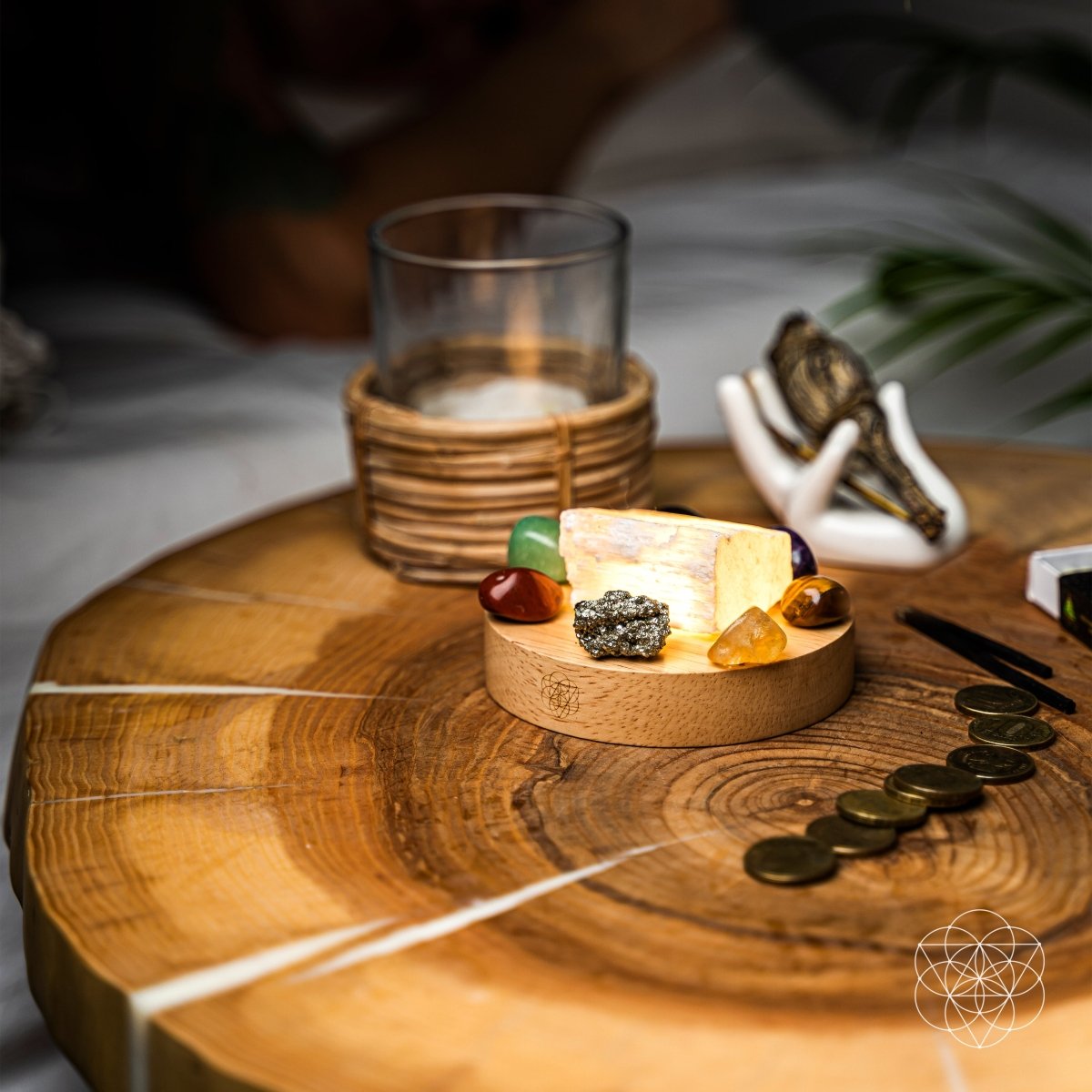 Placing the lamp in your bedroom is ideal as you will harness its energy before bed, while you sleep, and first thing in the morning—when your energy is most potent. You can form crystal grids with the stones or choose your favorite ones to meditate with. Write your intentions down under the soft light of the lamp and slide the piece of paper under the central stone to turbocharge their energy.